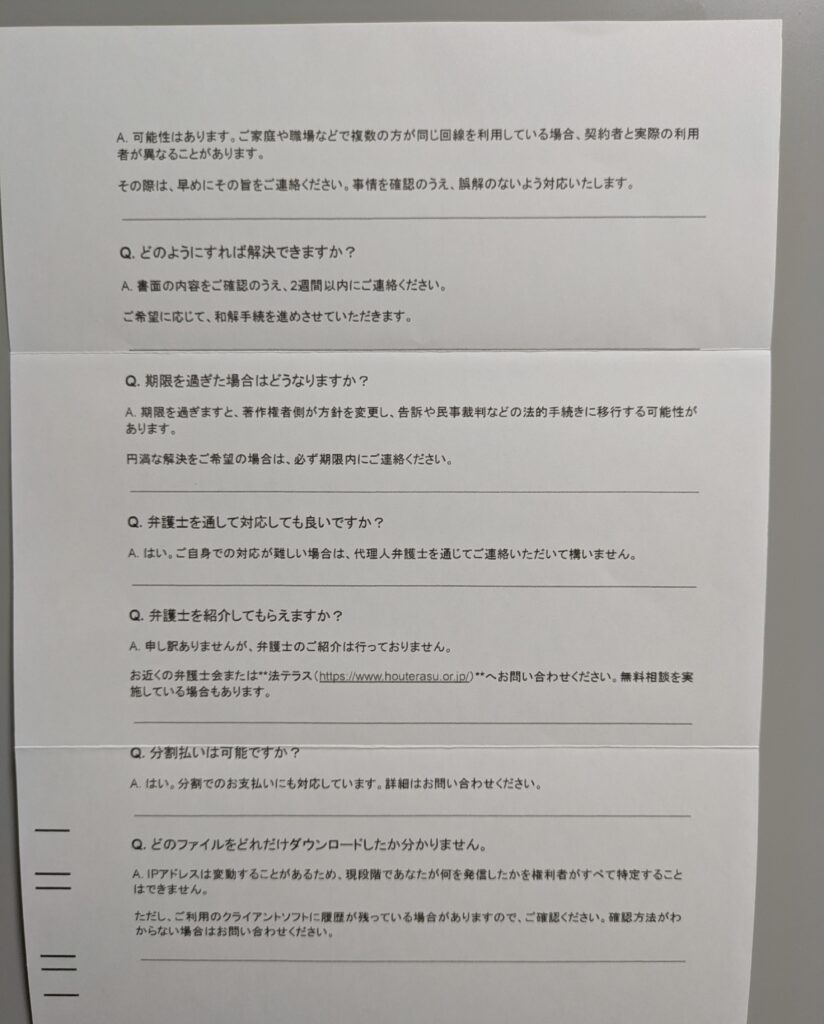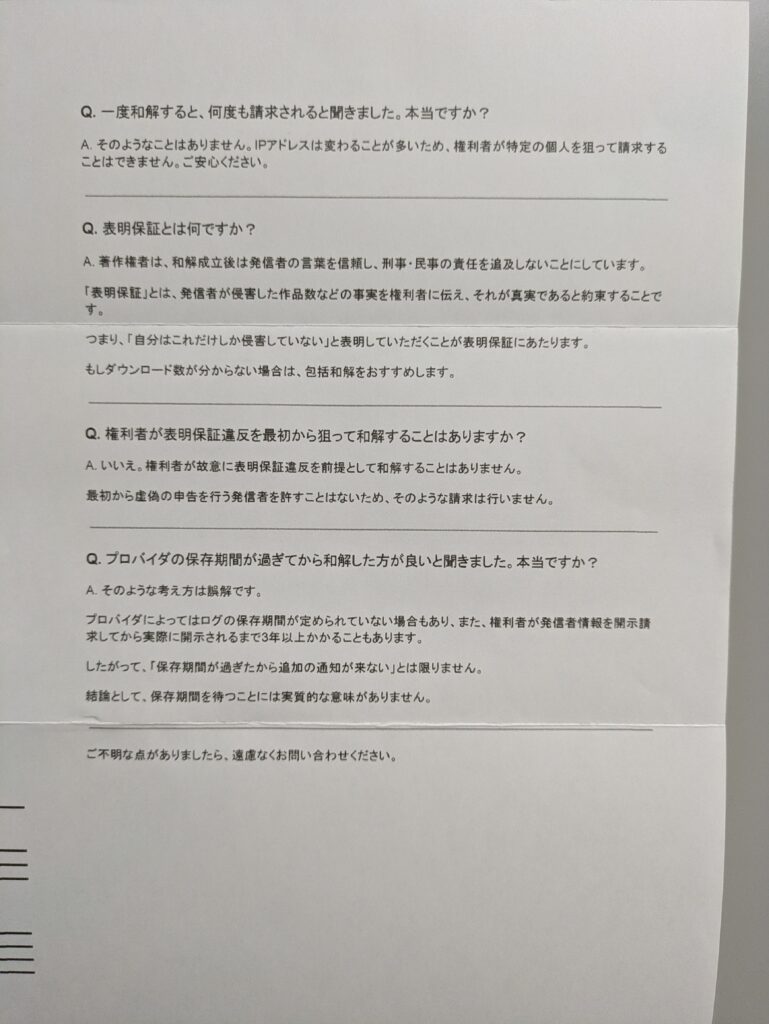 しかし、この書面にはまず「複数作品・複数メーカーからの請求」について十分に触れられていませんけれども、目の前の件だけ和解をすることが、本当に発信者にとって「円満」なことなのでしょうか。
