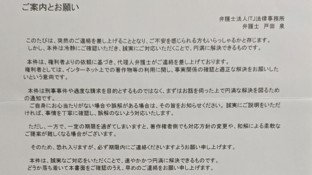 本記事では、連絡文(権利者側代理人が事件処理の一環として送付しているもの。)の内容について、発信者側代理人を務める弁護士の立場から検討をしています。