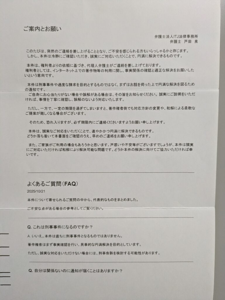11月下旬ごろから、ITJ法律事務所の受任通知に添付書類が追加されるようになりました。