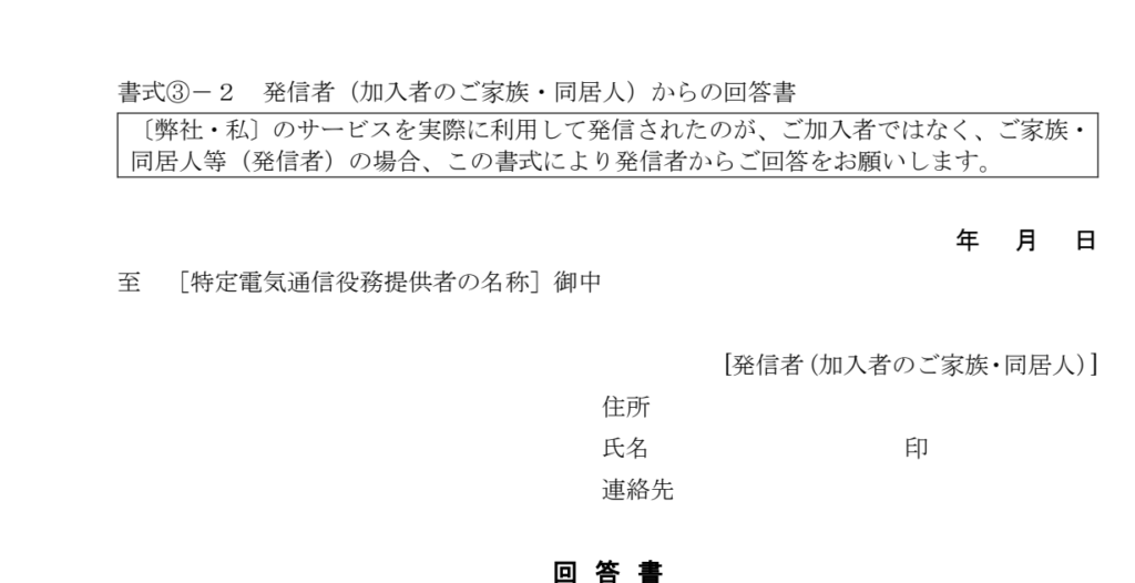 一点注意ですが、今回は「加入者(プロ助さん)」と「発信者(はつおさん)」が異なるので、回答書は、「発信者(加入者のご家族・同居人)からの回答書」というほうの書式を使うことになります。